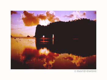 The sun lowers itself in the Manu'a Islands illuminating sky and reef with tropical color.