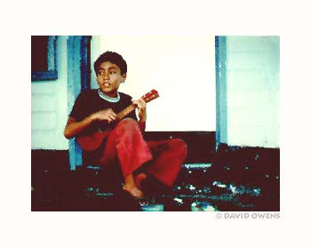 Etueni gazes out towards the ocean from his front door as he strums a song in the early evening on Tutuila. Listen to a gentle guitar tune from fa'asili who learned it from Malele, his 77-years-young mother. Your browser does not support the audio element.